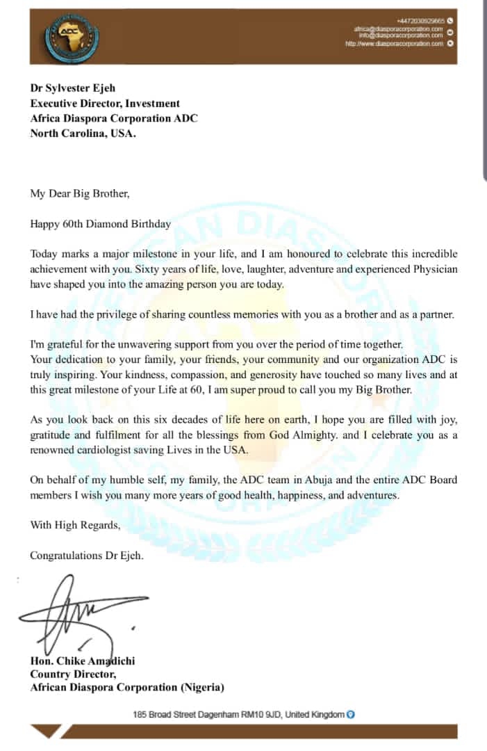 The Country Director, African Diaspora Corporation, ADC (Nigeria), Hon. Chike Amadichi has joined men of goodwill across the globe to celebrate renowned medical icon, and Executive Director, Investment Africa Diaspora Corporation (ADC) North Carolina, USA, Dr Sylvester Ejeh on his 60th birthday.
