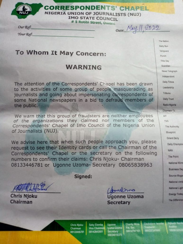 “We warn that this group of fraudsters are neither employees of the organizations they claimed nor members of the Correspondents’ Chapel of Imo Council of the Nigeria Union of Journalists (NUJ)”