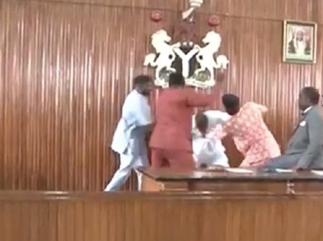 — Lawmakers could be seen exchanging blows among each other A shocking video of the members of the Edo House of Assembly beating each other after the impeachment of the speaker, Justin Okonoboh, has emerged.