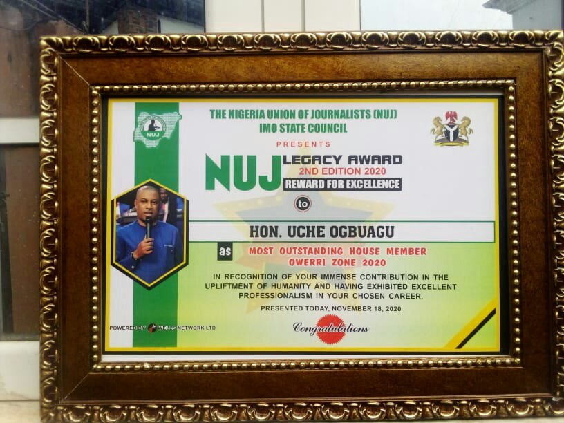 The encomium came through the Chairman Nigeria Union of Journalists NUJ, Imo State Council, Comrade Chris Akaraonye, while presenting the NUJ Legacy award 2nd edition 2020 reward for excellence to Amb. Uche Ogbuagu as MOST OUTSTANDING HOUSE MEMBER OWERRI ZONE 2020 on Friday March 20, 2021 at the conference Hall of Amb. Ogbuagu’s countryhome in Akabo Ikeduru area of the state.
