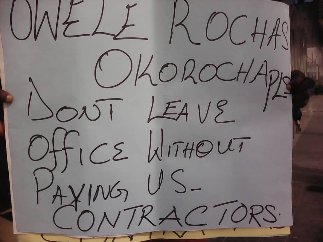 The Imo Contractors carried placards which have inscriptions as “A Laborer Deserves His Wages. We Are The Laborers Behind Rescue Mission, Pay Us– Imo Contractors.