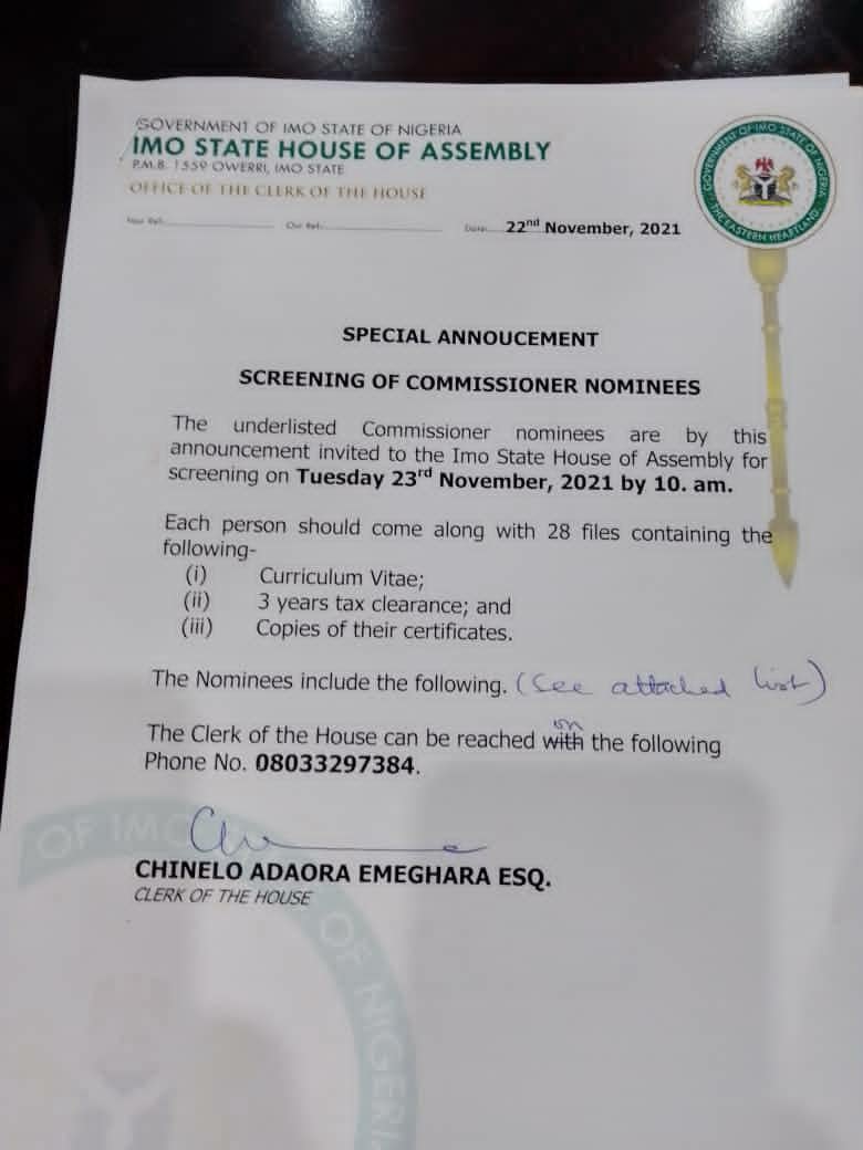 “The underlisted Commissioner nominees are by this announcement invited to the Imo state House of Assembly for Screening on Tuesday 23rd November, 2021 by 10am”