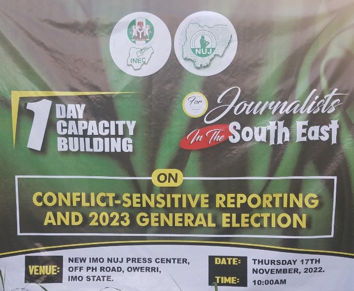 The NUJ in collaboration with INEC gave the charge in a workshop organized for South East Journalists on “Conflict -Sensitive Reporting and 2023 General Election”, at the new NUJ Press center, off Port Harcourt Road Owerri, Imo State.