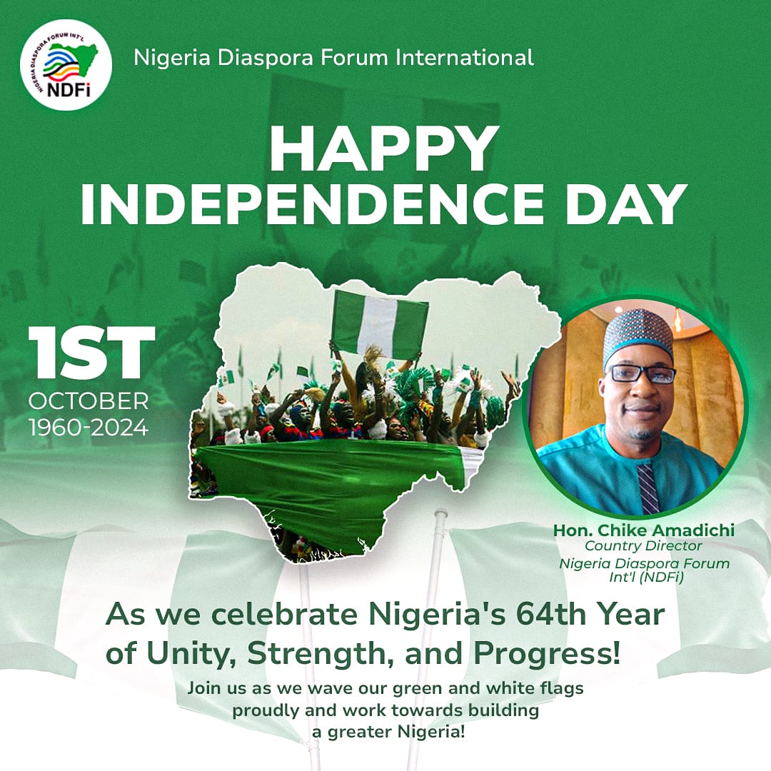 The Country Director of Nigeria in Diaspora Forum International, NDFi, Hon. Chike Amadichi has in the spirit of the 64th Independence anniversary celebration, enjoined Nigerians to celebrate their individual and collective achievements as Nigerians while urging them to keep all hope alive as it is not late until it is late hence “Nigeria Shall Overcome”