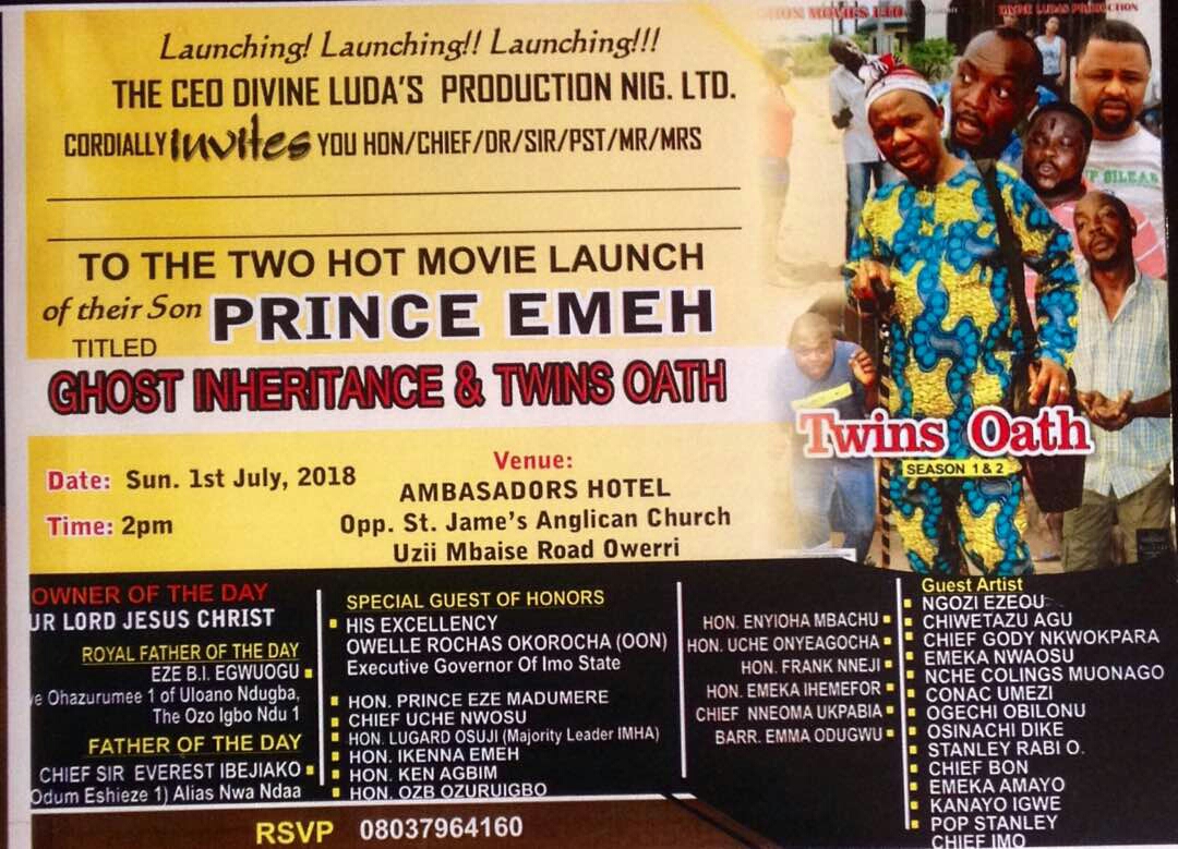 The Chief Executive Officer of Divine Luda’s Production Nigeria Limited and producers of Twins oath , Inseparable Twins , Izunna, among others presents ‘Ghost Inheritance and Twins Oath’, the hottest home videos in the history of Nollywood to the market come this weekend.