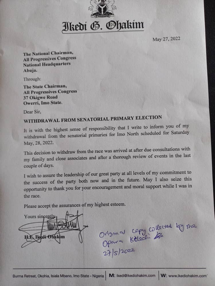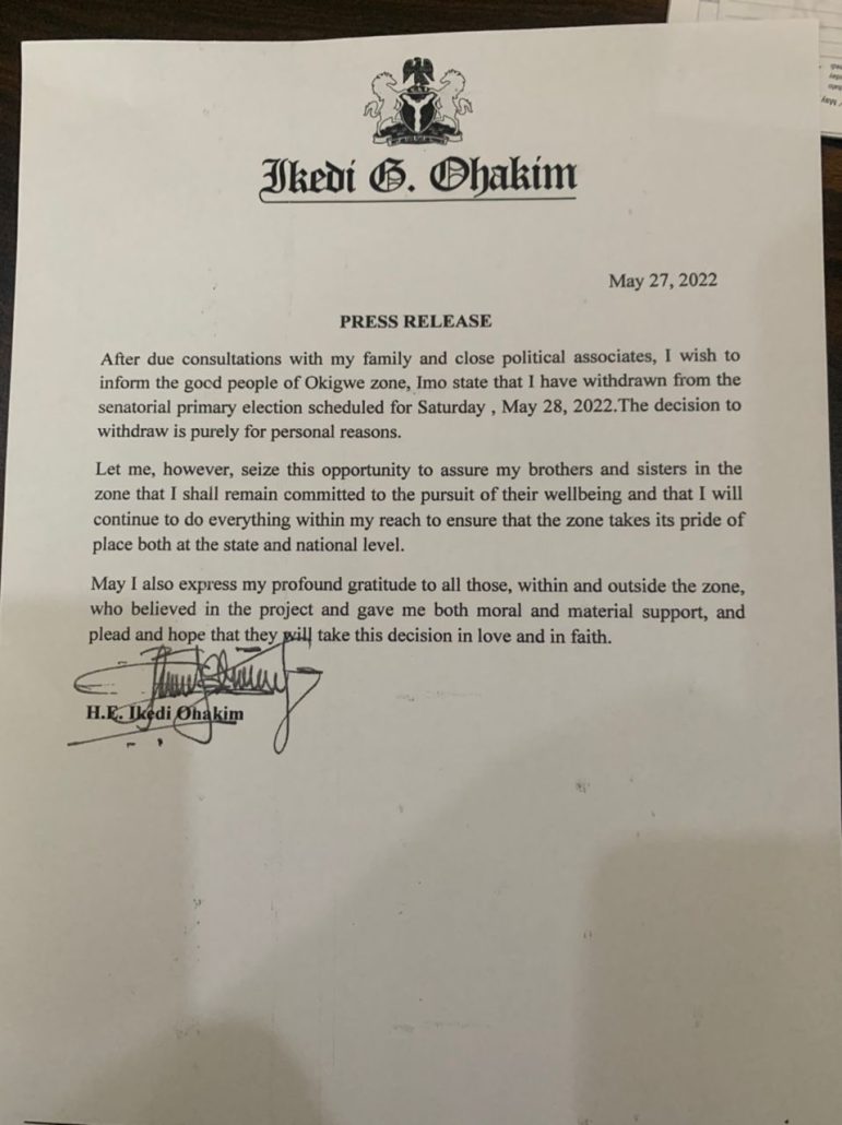 It is with the highest sense of responsibility that I write to inform you of my withdrawal from the senatorial primaries for Imo North scheduled for Saturday, May 28, 2022″