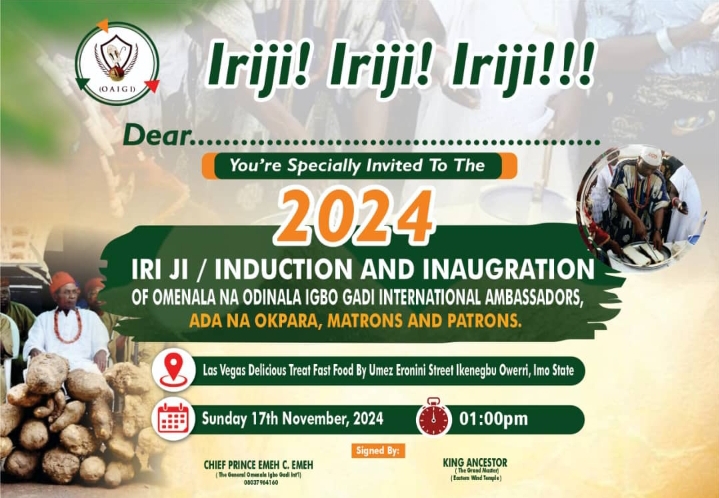 A frontline Igbo cultural heritage and sustainability advocacy organization, Omenala Igbo Ga Adi International (OAIGI), has concluded plans to mark her 2024 Iriji (New Yam) festival in grand style on Sunday, 17th November 2024 as the management sends “Special Invitations” to Dignitaries across board to grace the occasion.