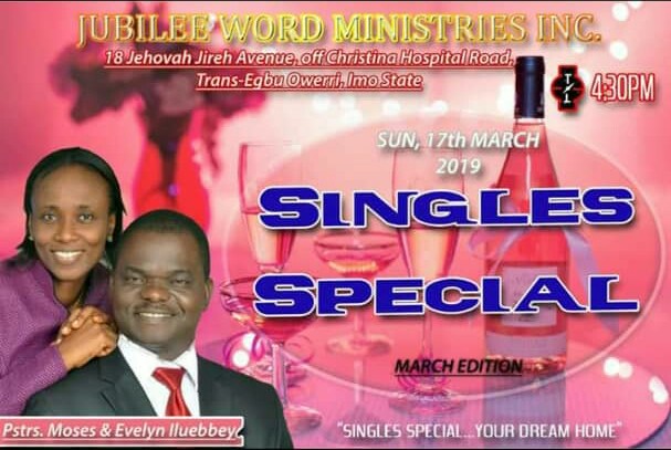 SINGLES SPECIAL comes up on the 3rd Sunday every three months by 4.30pm at Jubilee Word Assembly -18 Jehovah Jireh Avenue, off Christina Hospital Road, Trains-Egbu.
